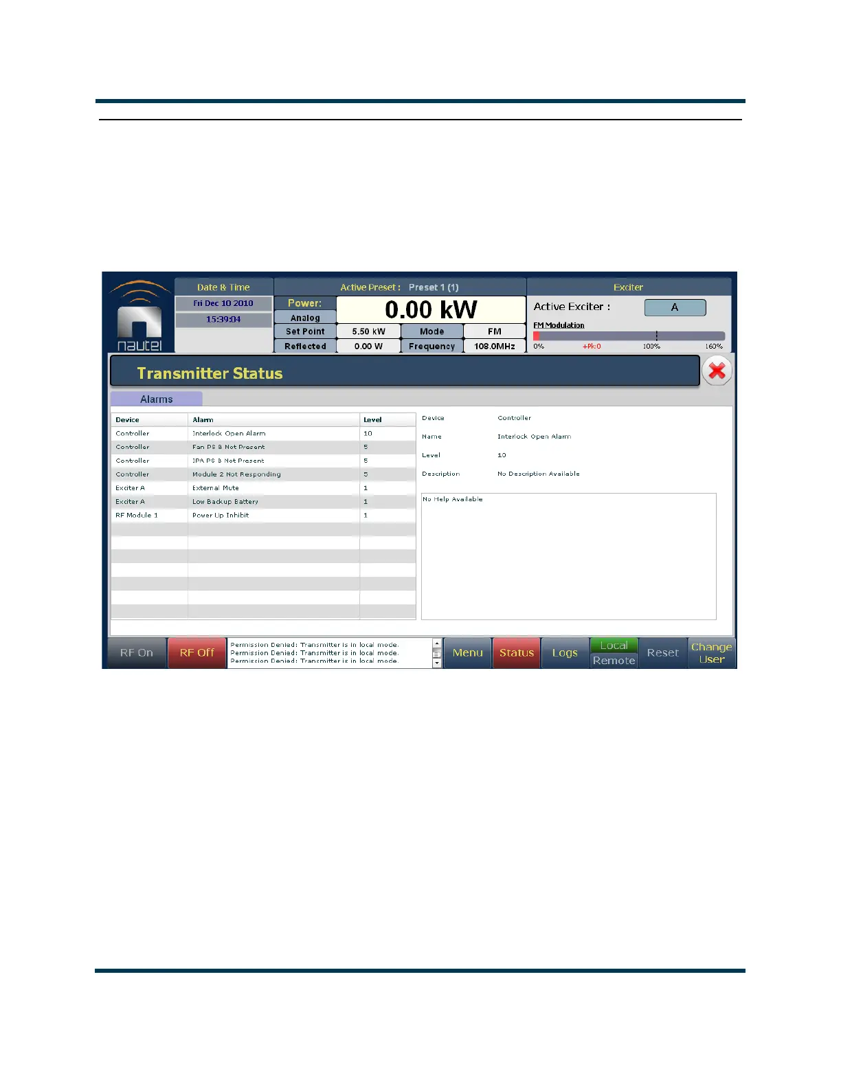 The best way to identify an alarm is by viewing the front panel’s Transmitter Status page