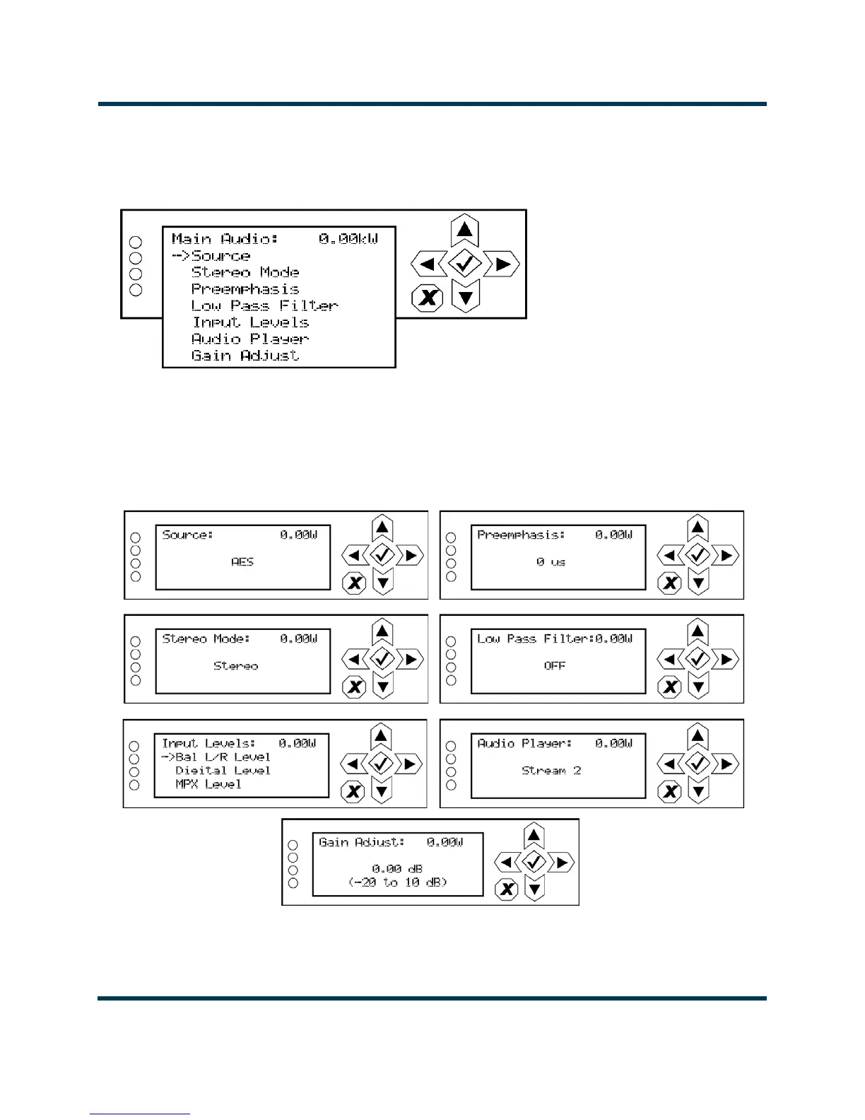 screens for the Main Audio menu. Press the cancel (X) button to discard changes and return to the