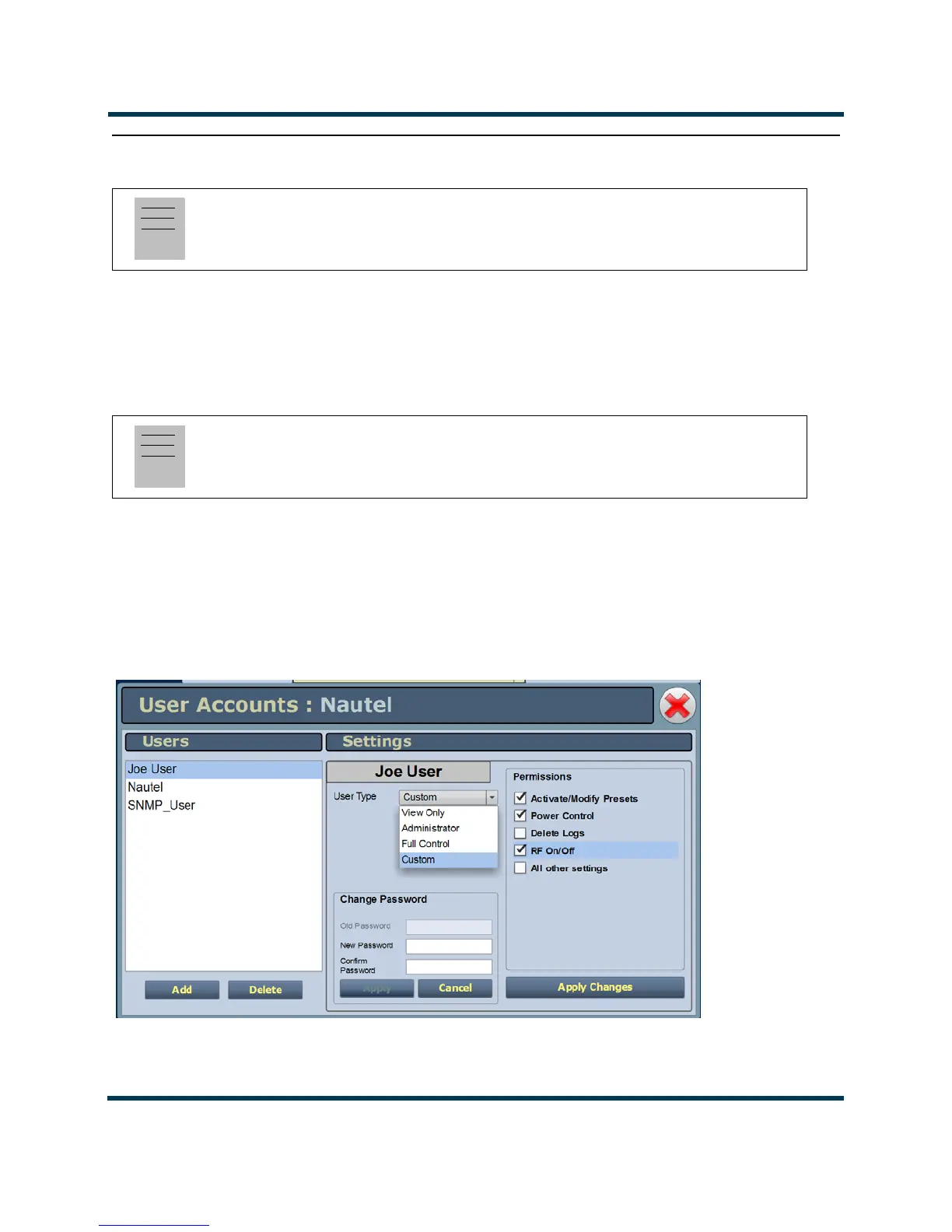 (Auto) in the List of Users and has Super User permission level. The default Username is “Nautel”.