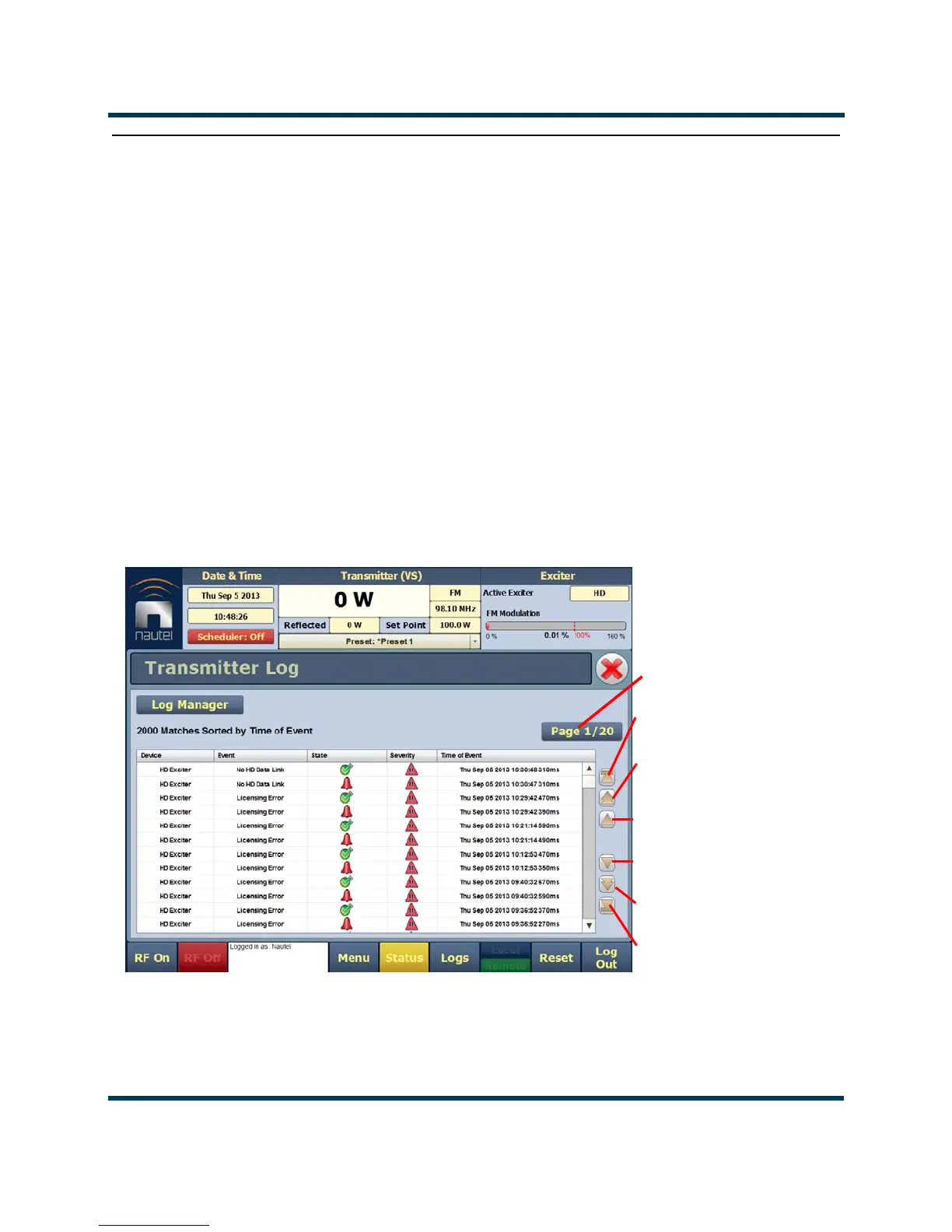 • Transmitter Log - Using the front panel - see page 2-28