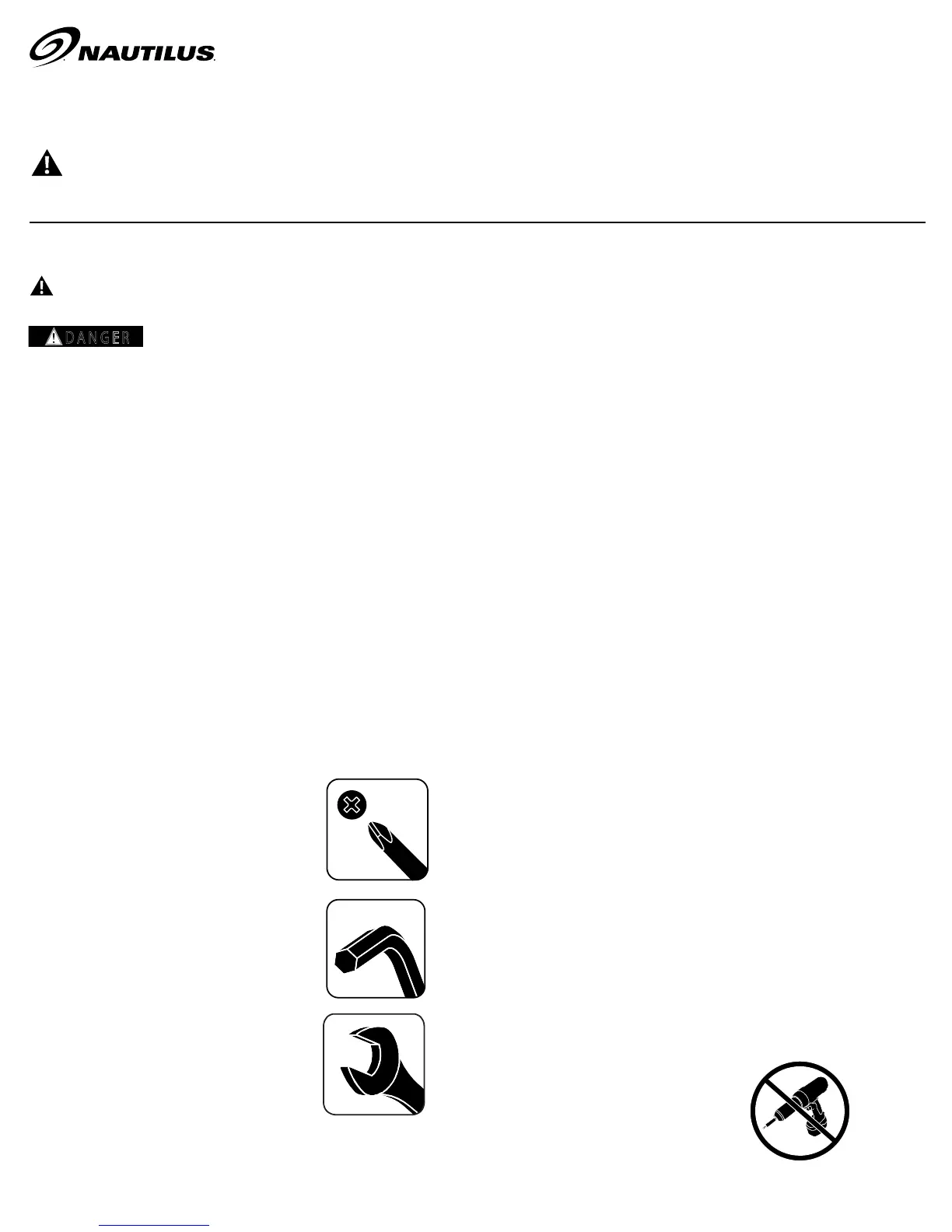• If replacement parts are necessary, use only genuine Nautilus replacement parts and hardware. Failure to use genuine replacement parts