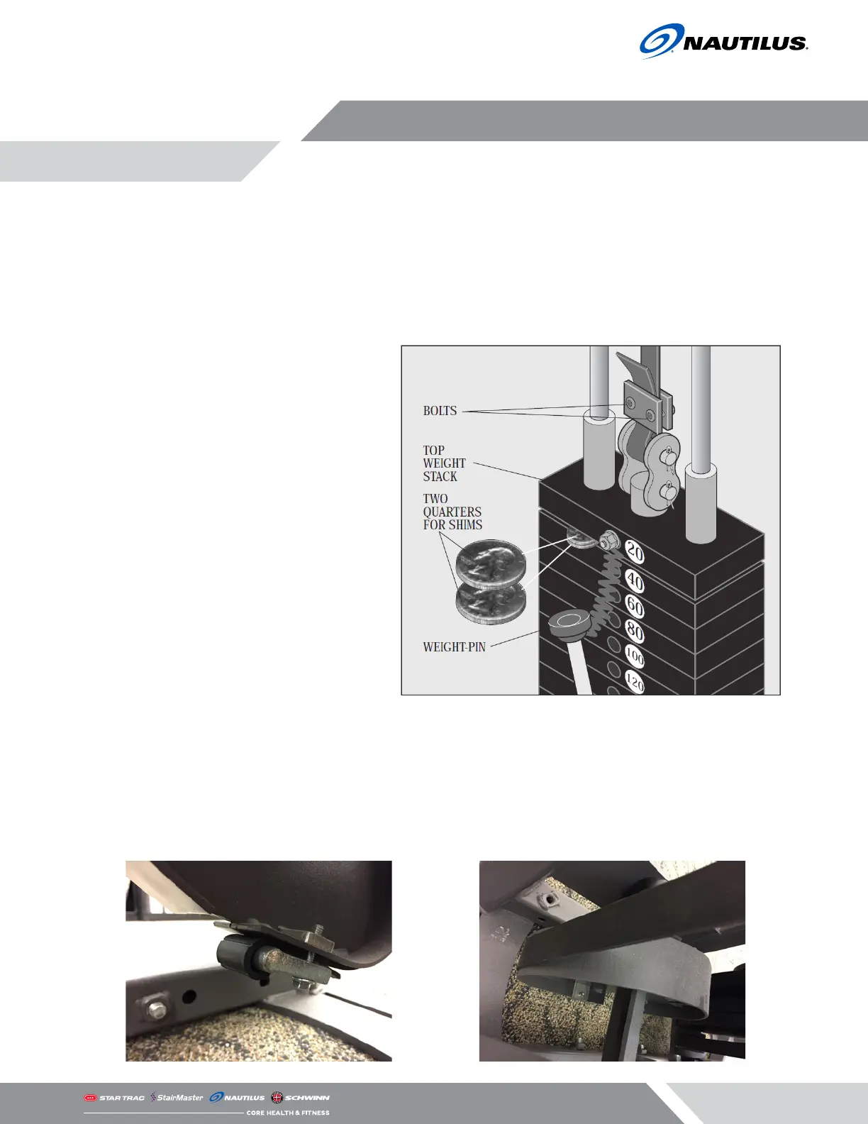 7. Tighten belt bolts and lift top weight to remove the shim.