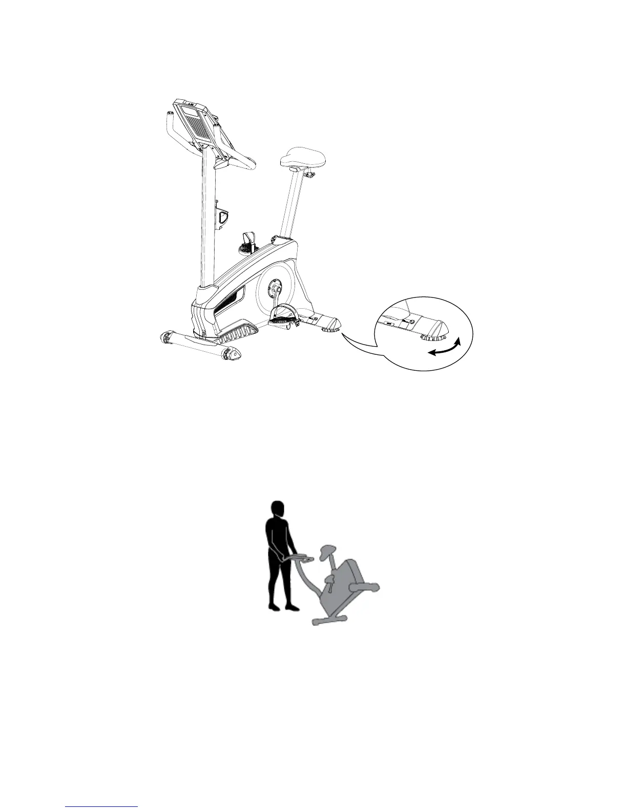 To move the upright bike, carefully tilt the Handlebars toward you while pushing the front of the bike downward. Push the