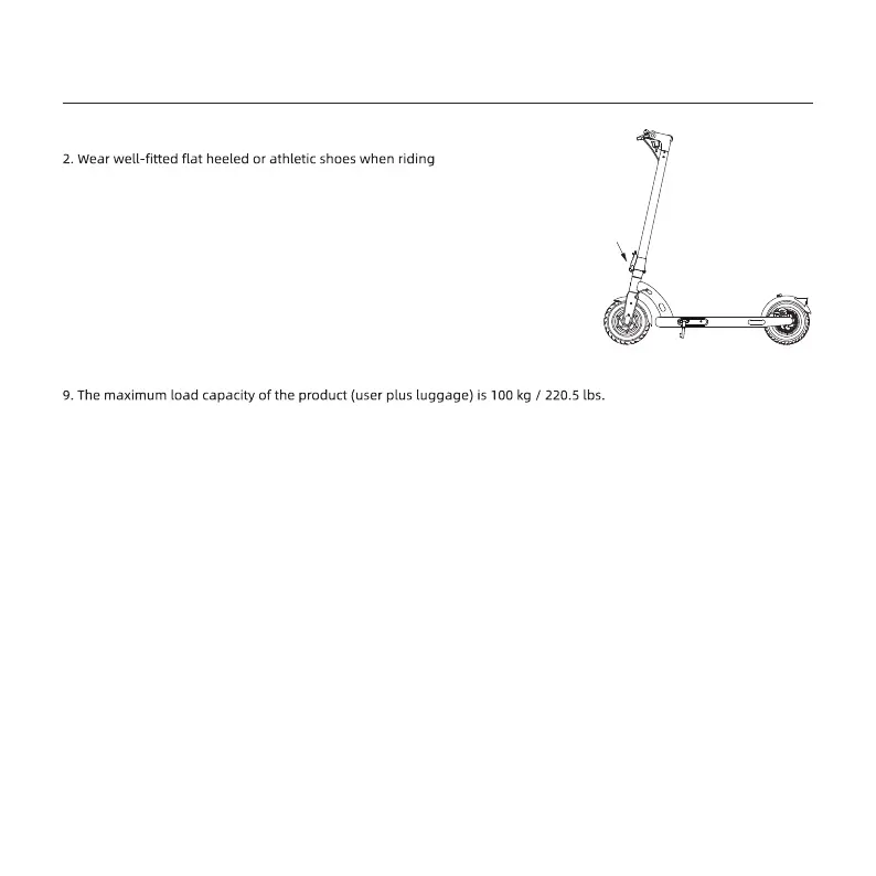 11. Do not hang or place objects on the scooter body or its handlebars.