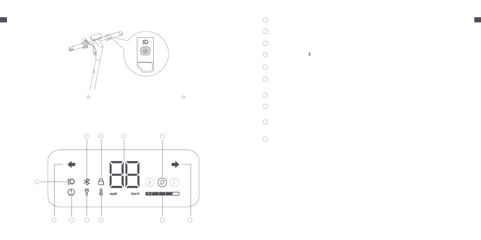 Voyants indicateurs : Lorsque la trottinette est opérationnelle, appuyez sur le bouton de voyant gauche ou