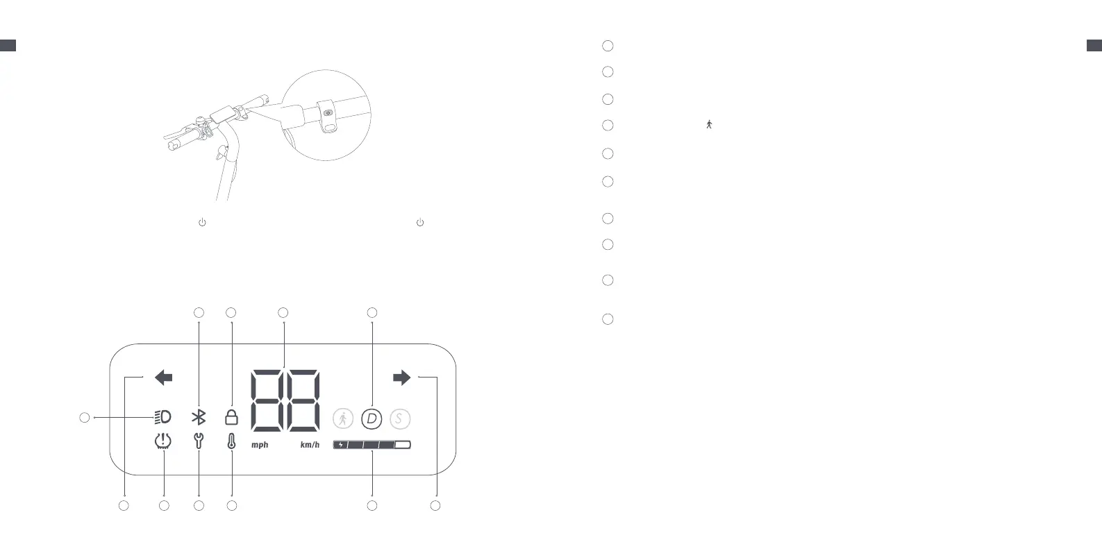 Voyants indicateurs : Lorsque la trottinette est opérationnelle, appuyez sur le bouton de voyant gauche ou