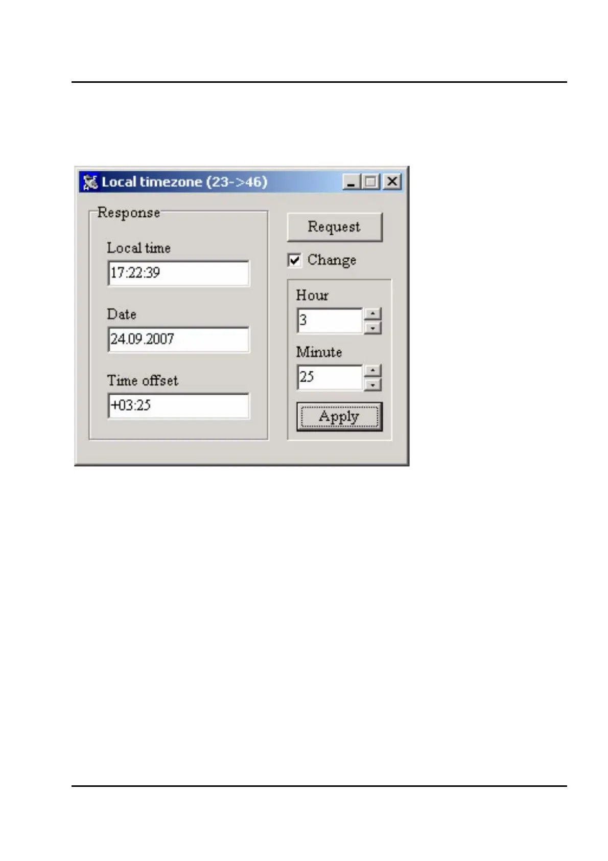 The Response group box contains local date, local time and local timezone offset from GMT. Those