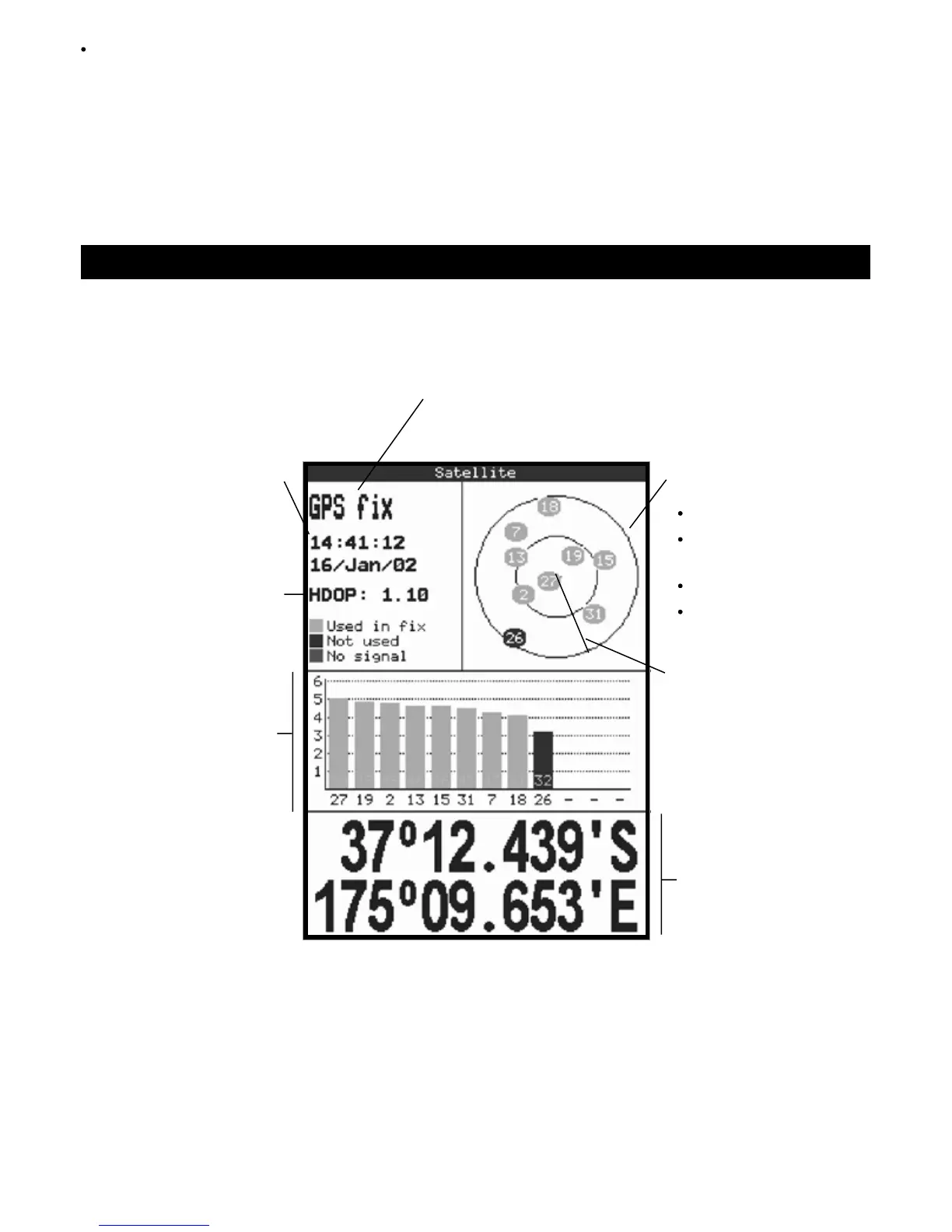 Status of GPS antenna, for example Acquiring, GPS fix, No