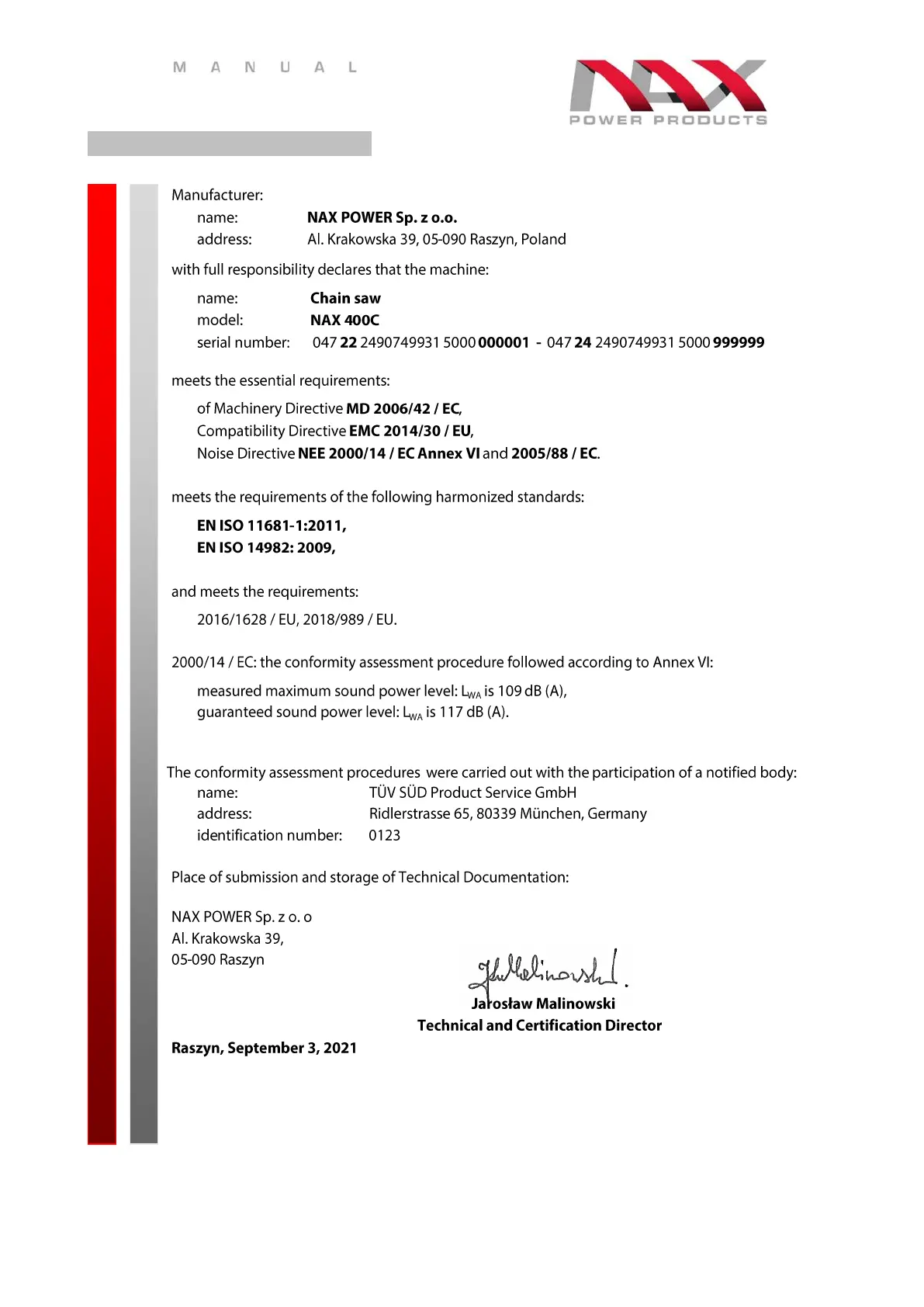 NAX 400C - Declaration of Conformity