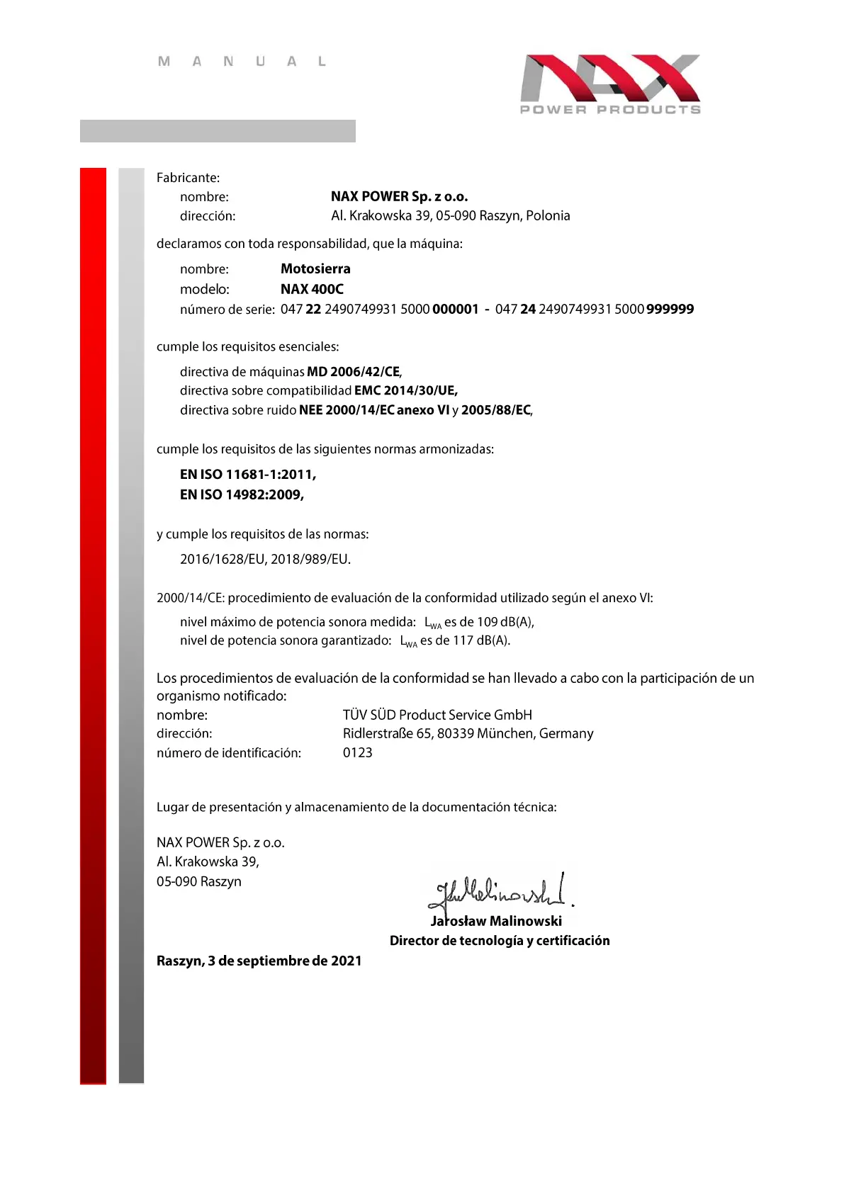 NAX 400C - Declaración de Conformidad
