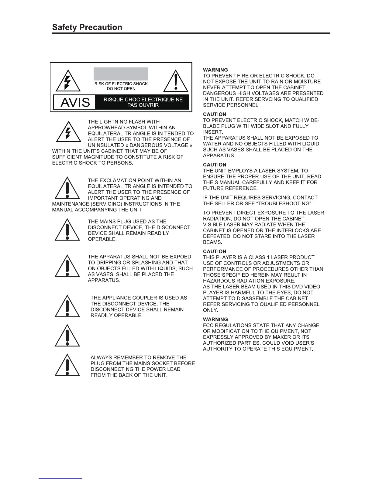 Naxa ND-856 - Safety Precautions; Electrical and Fire Safety; Laser Safety Guidelines; Regulatory Compliance