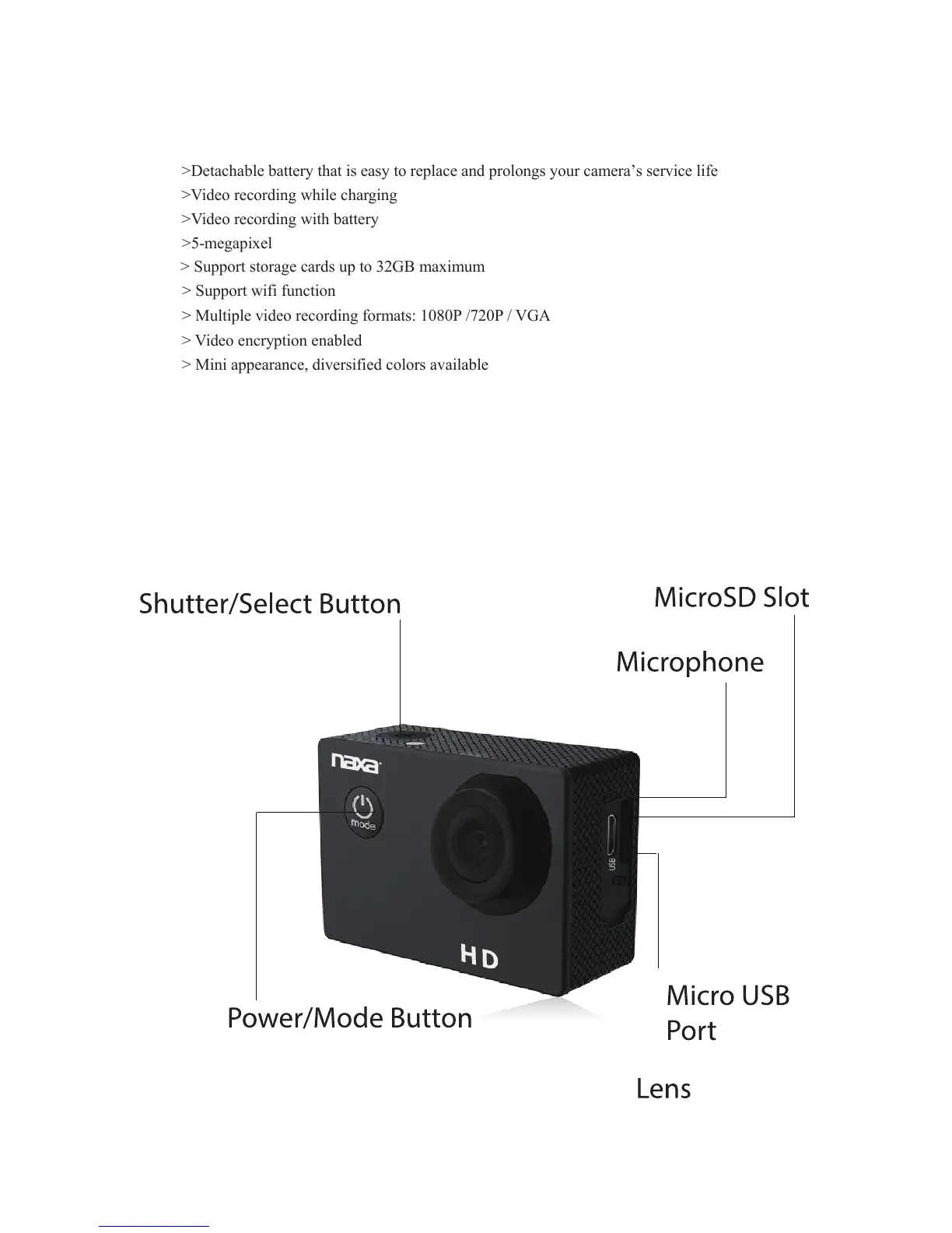 > Multiple video recording formats: 1080P /720P / VGA