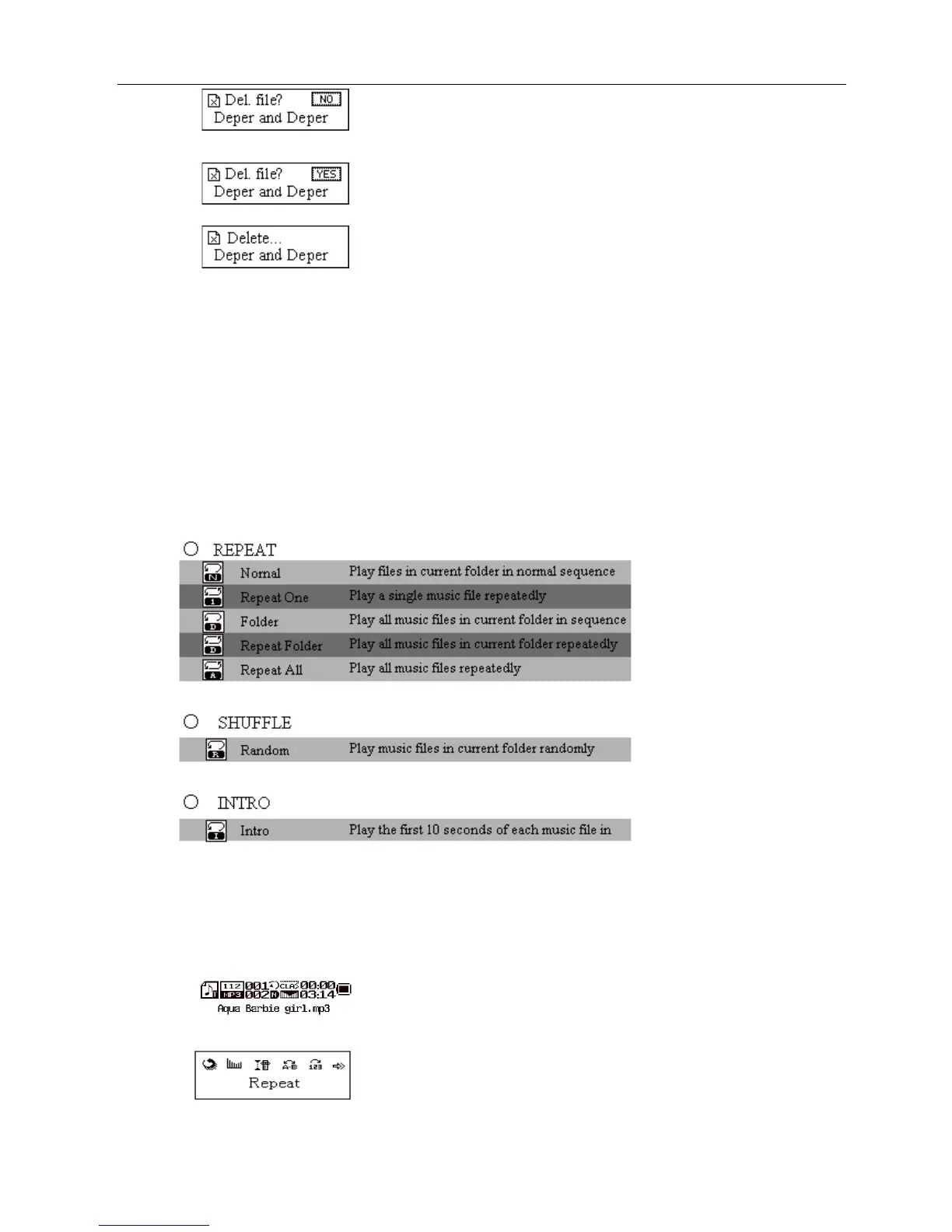 executing “Delete All”, all the music files in current files may be deleted, while recorded files without change.)