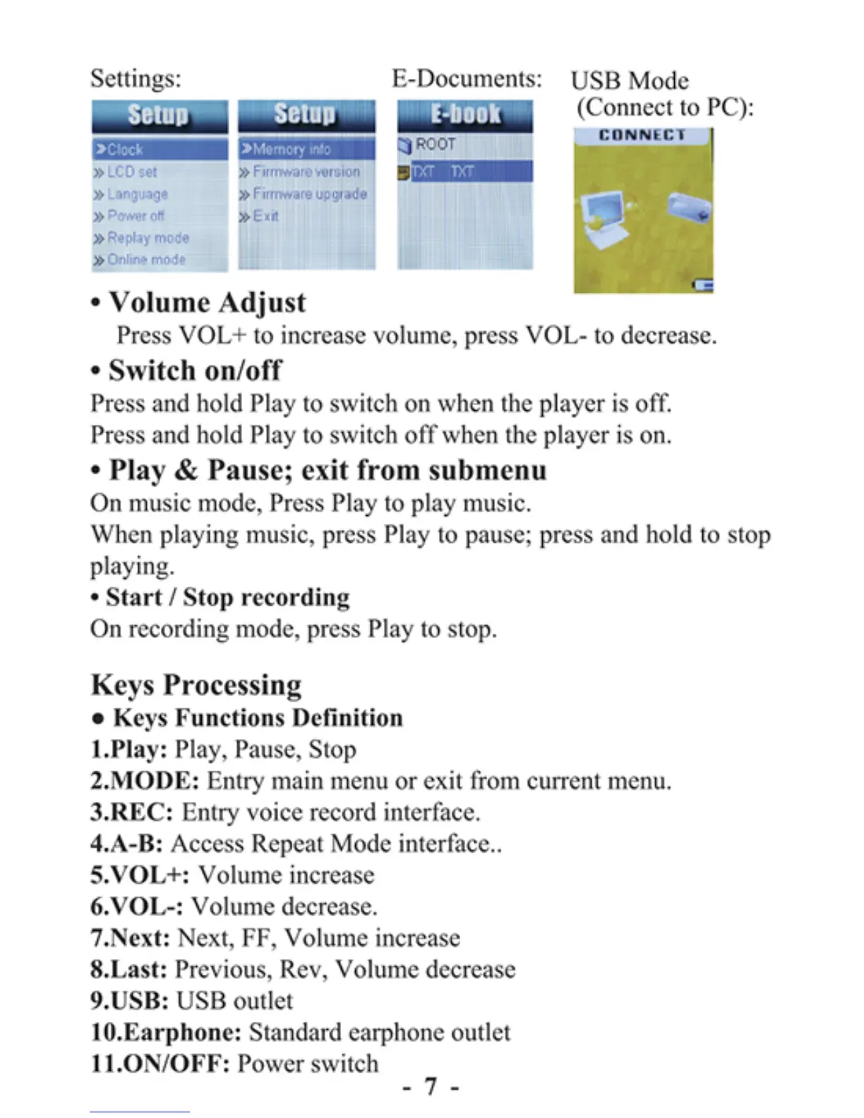 Naxa NMV-173 - Keys Processing; Key Function Definitions; Volume, Power, and Playback Controls; Recording Controls