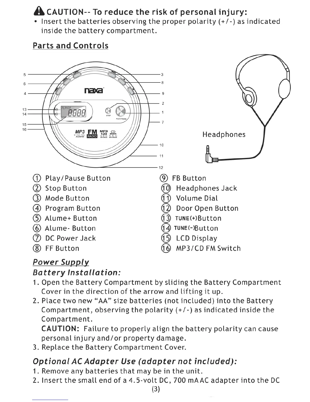 Naxa NPC-330 - Parts and Controls; Power Supply and Battery Installation