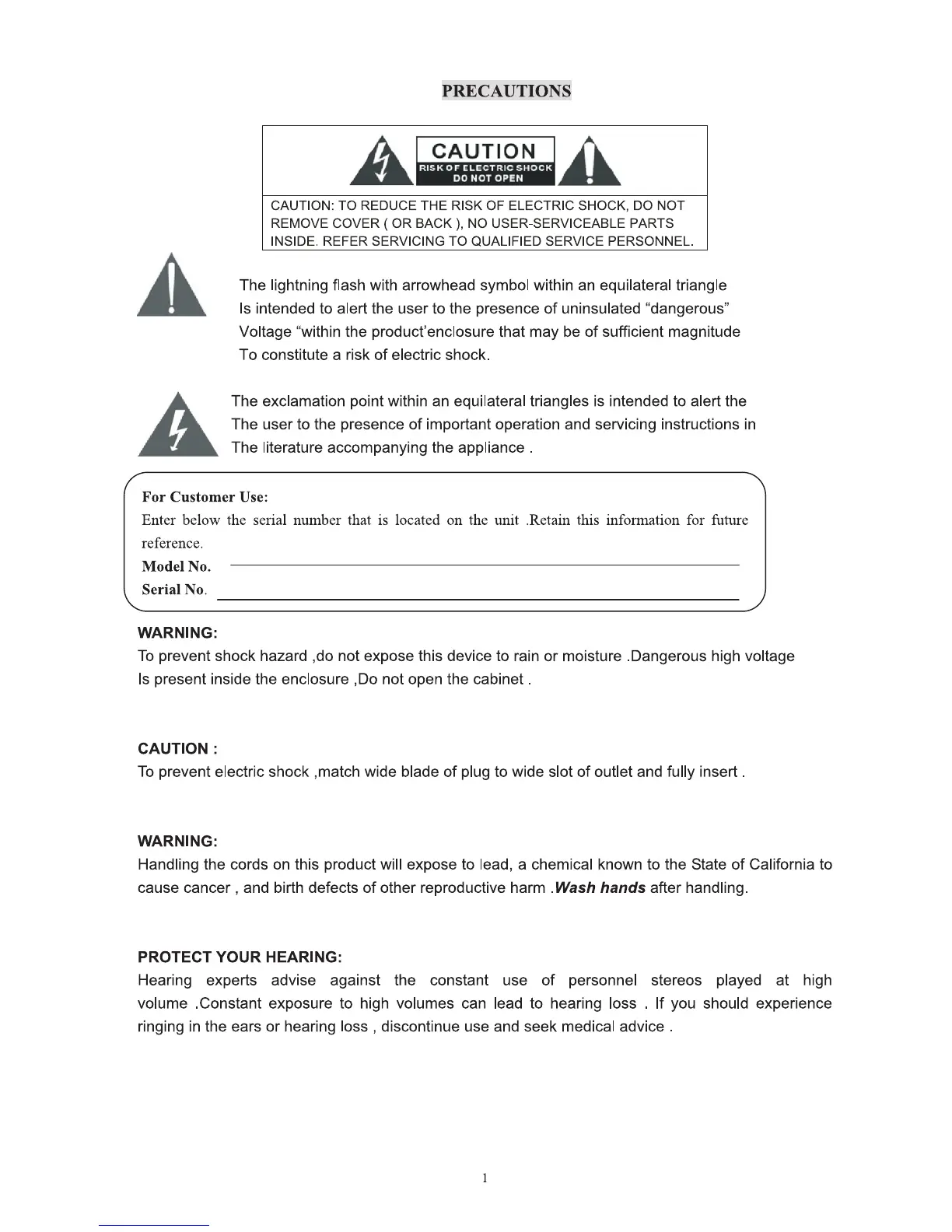 Naxa NS-433 - Precautions for Safe Operation; Electrical Safety and Warnings; Health and Hearing Protection