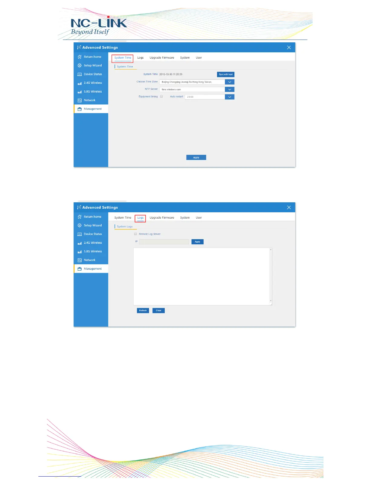 Logs: the system logs can be enable or disable, user can view the system log
