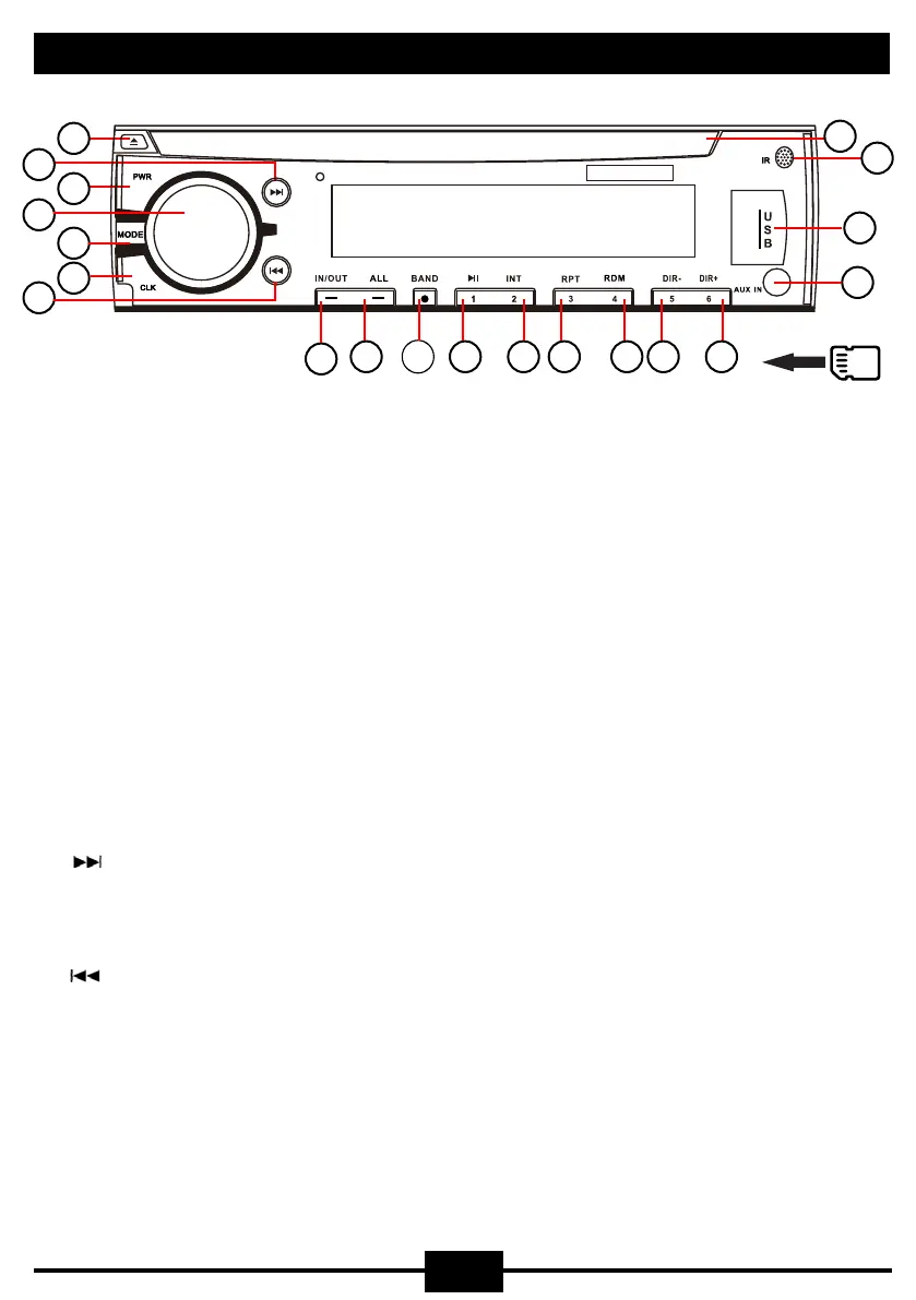 - DVD/CD/BT/USB/SD mode, short press next chapter/track/song