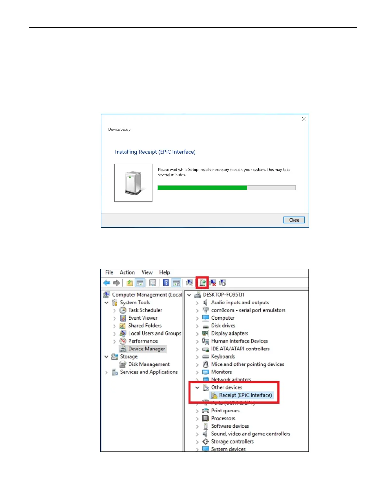 Device Setup window displays that the Installing Receipt (EPiC Interface) process is