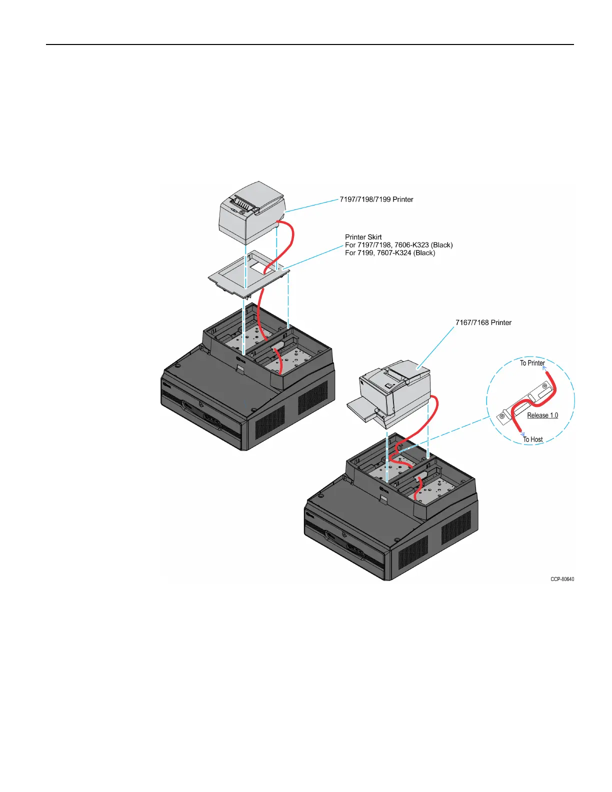 • For NCR 7197/7198/7199, first install the Printer Skirt, route the cable out the