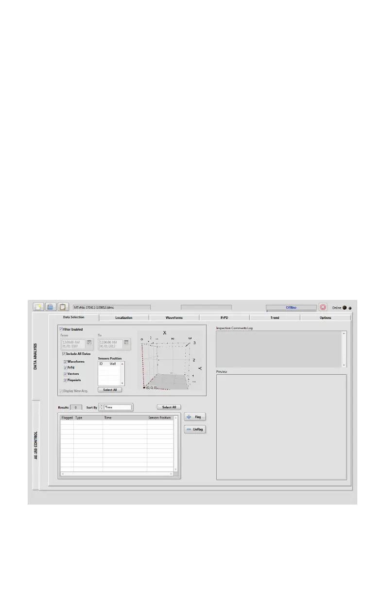 Waveforms, PrPD, Trend and Options) where acquired data will be analysed,