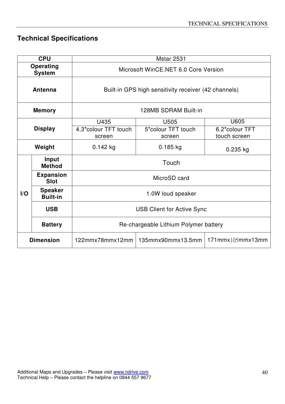 NDrive Binatone U505 - Technical Specifications