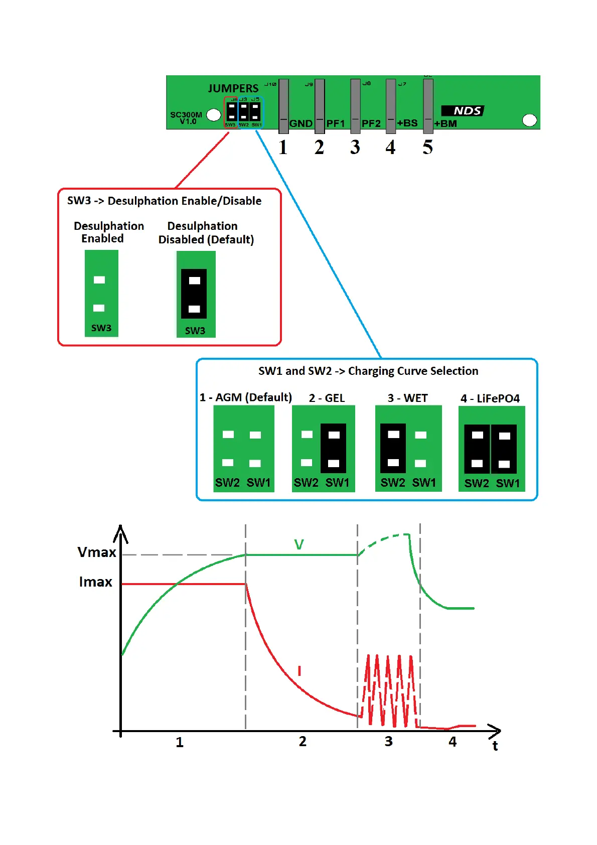 NDS SC300M - CHARGING CURVE SELECTION; Jumper Settings for Battery Types