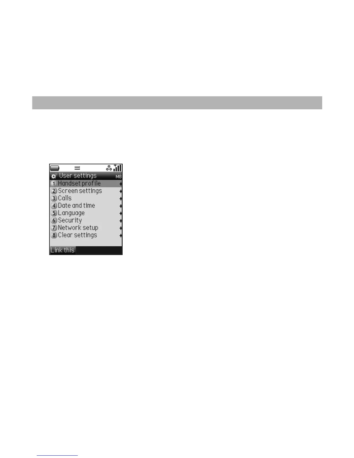 Press MENU key Select Settings icon or Press 8 User settings menu (see below).