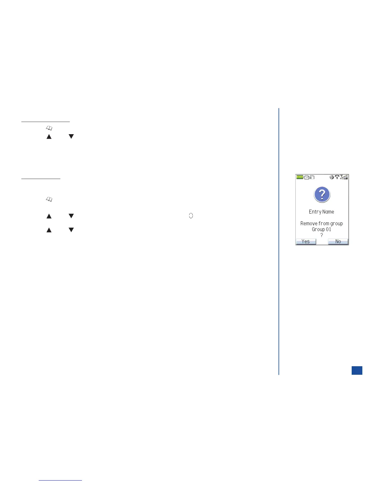 Press MENU (Options Menu),5,and 2 to display a decision screen stating, “Remove this entry from group name?” (See Flag.)
