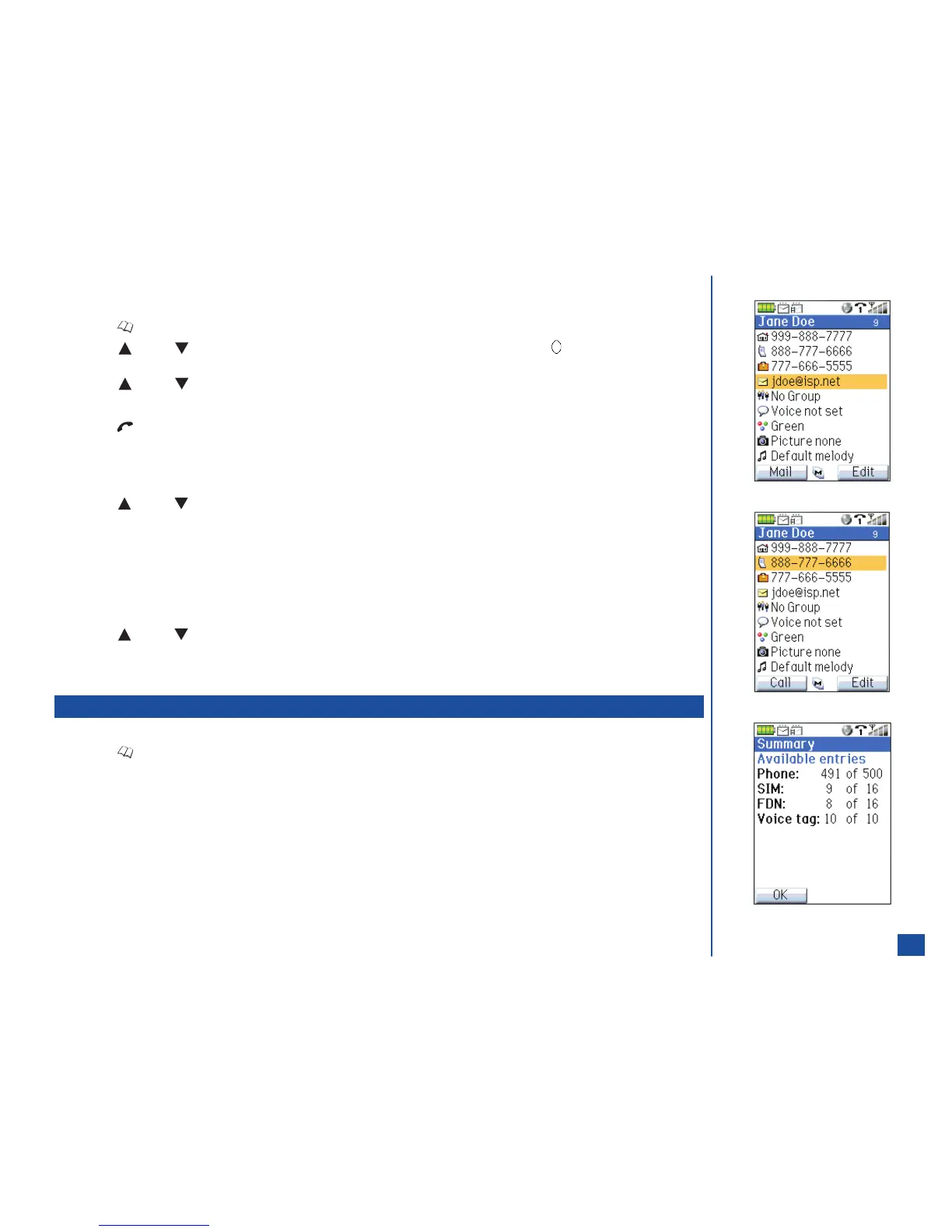 Press (Up) or (Down) navigation key to highlight the desired phonebook entry and press (Select) to display the