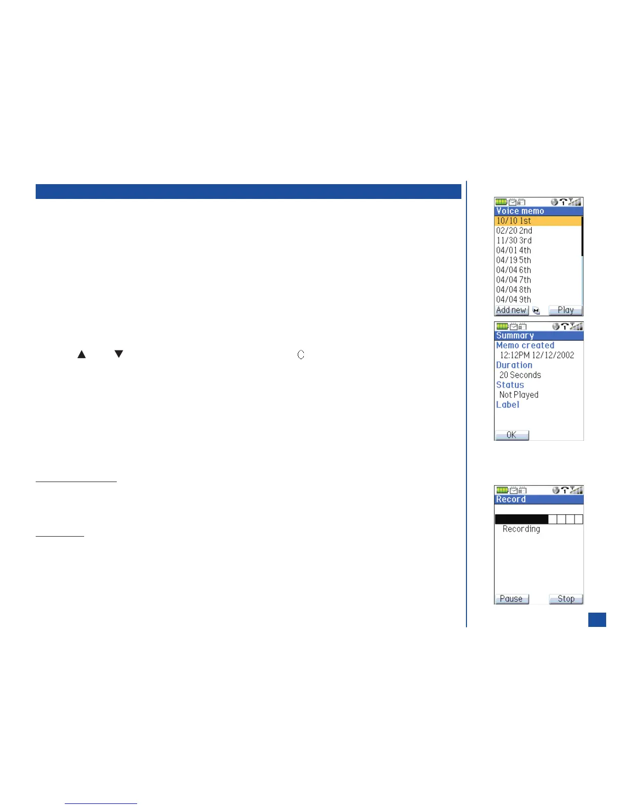 memo or a recorded conversation during a received or dialed call (see page 29). The Voice memo screen displays the memos in date