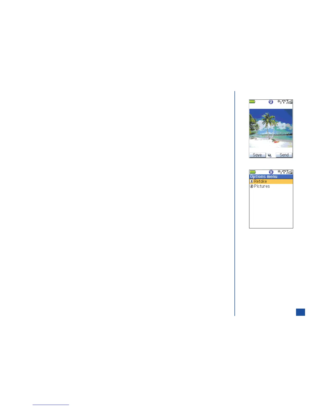 After a picture is taken and you are not satisfied with the picture, use the Save/Send Options Menu to retake the picture. Follow the
