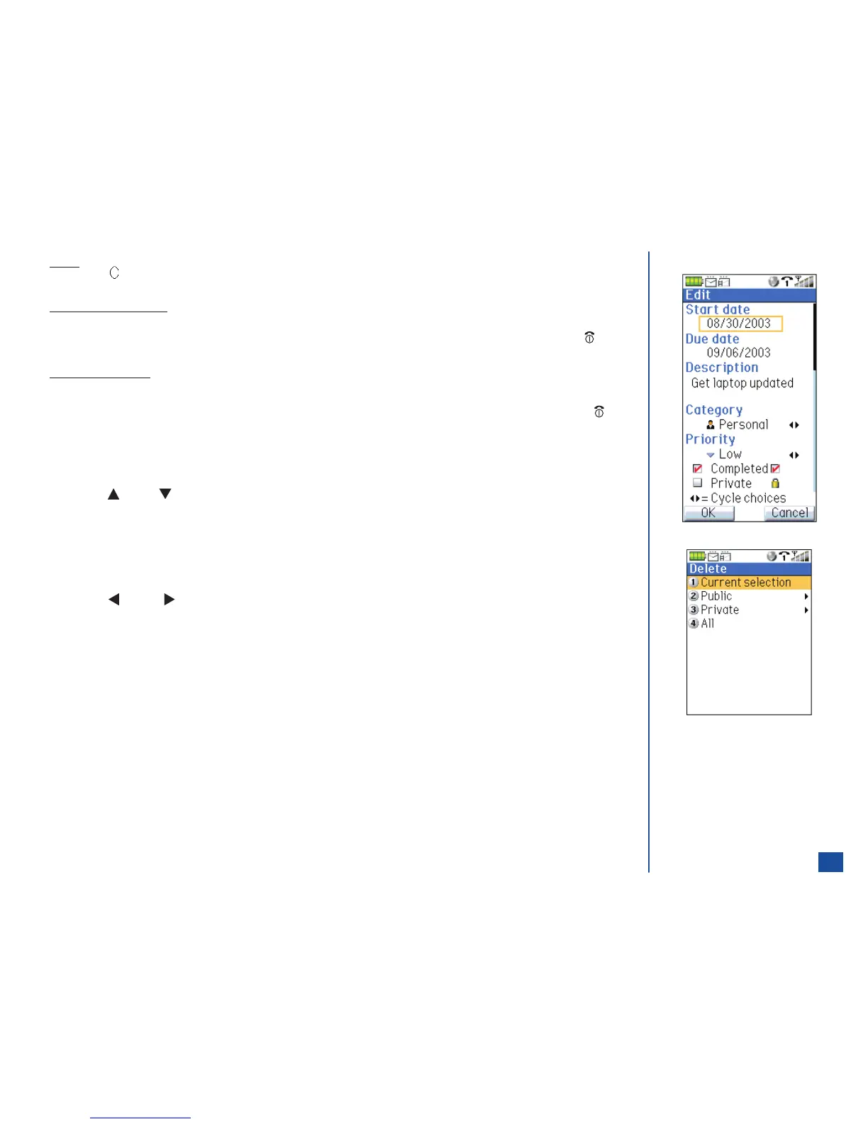 Press MENU (Options Menu) and 3 and a decision screen displays the task due date, task description, and “Delete this entry?