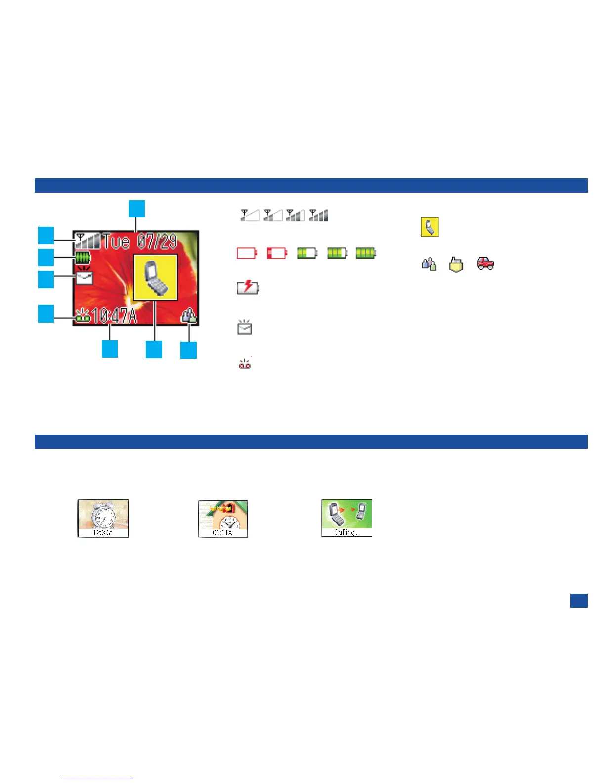 Second LCD screen icons display to indicate events such as “during call,” “on hold,” “communicating” (for IR exchange), “received call,” “dialing,” “receiving a message,” “display