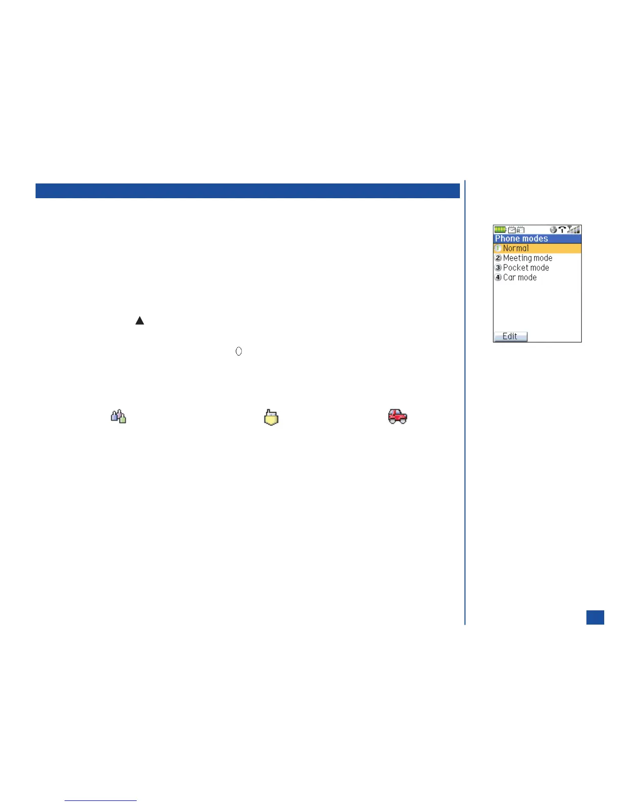 When a mode is selected, some of your phone’s settings are altered automatically to the respective mode name. The phone functions