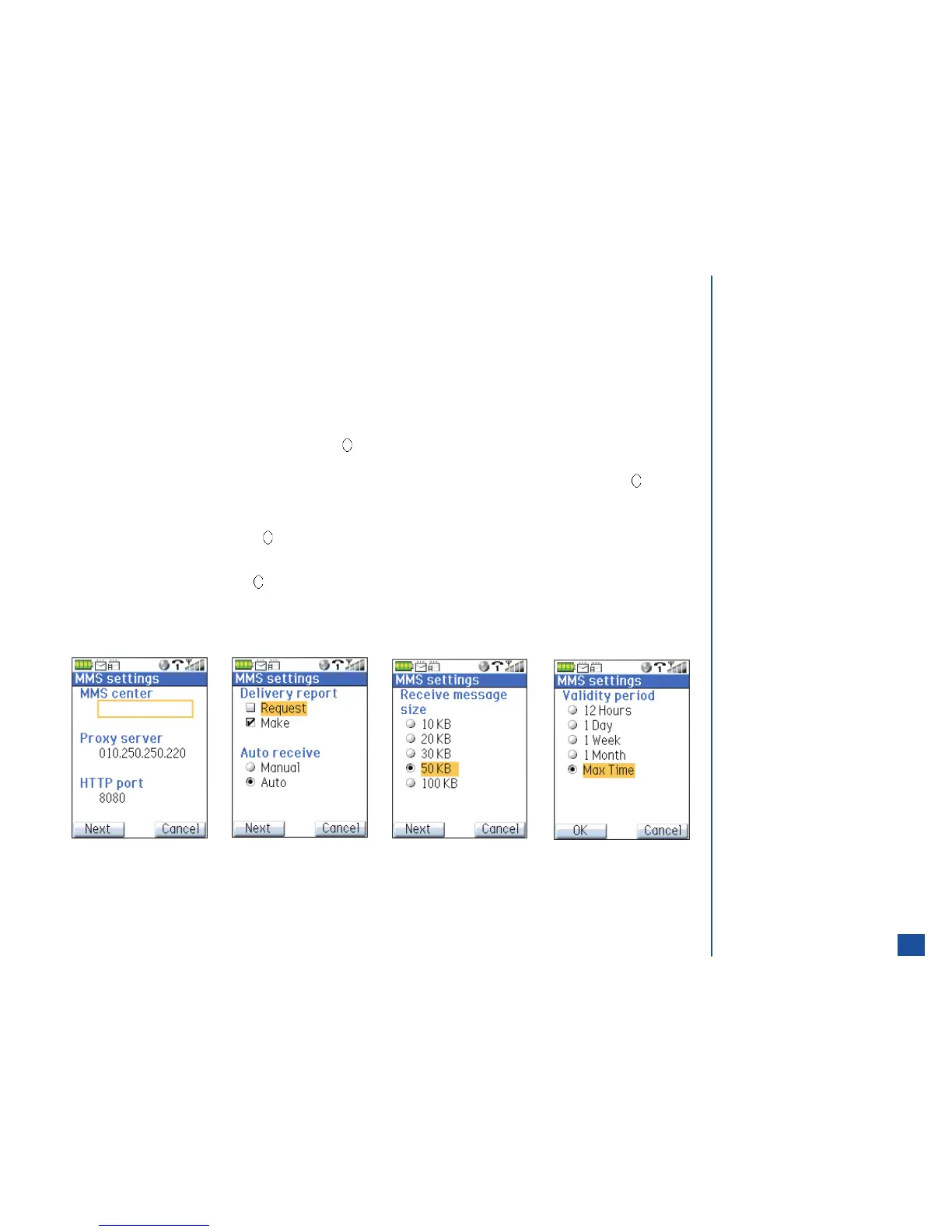 Press MENU (Options Menu) and 6 to display the first MMS settings screen.