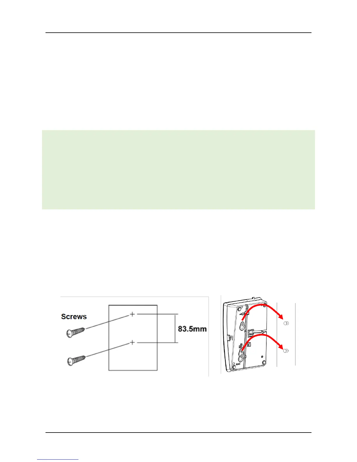 This telephone can be mounted on a wall with two screws. The screws shall be supplied by