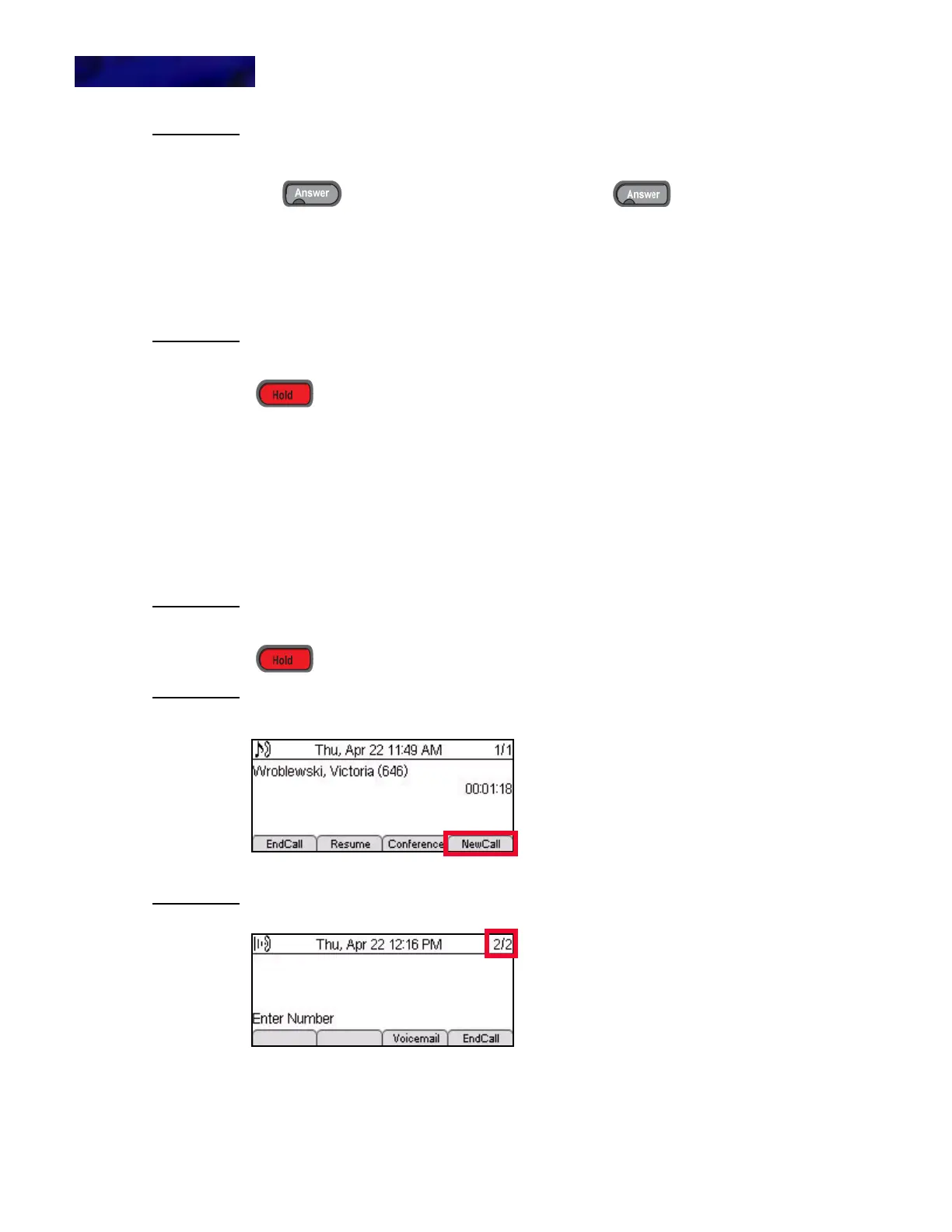 1 Press the Hold key to place the current call on hold, then press the NewCall Soft Key to