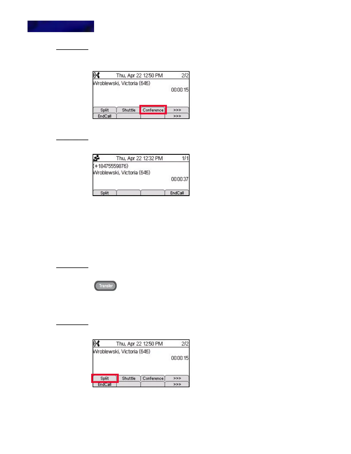 3 Press the Split Soft Key to split the transferred call into two separate calls.