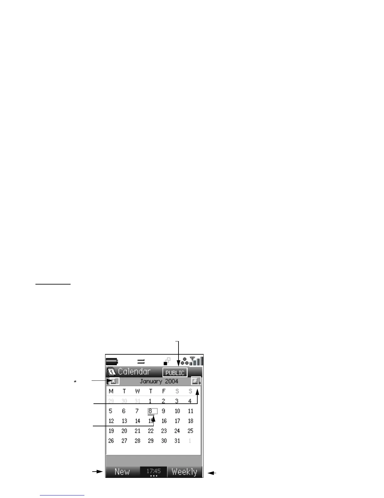 To display the calendar, press the MENU key and select Toolbox and Calendar.