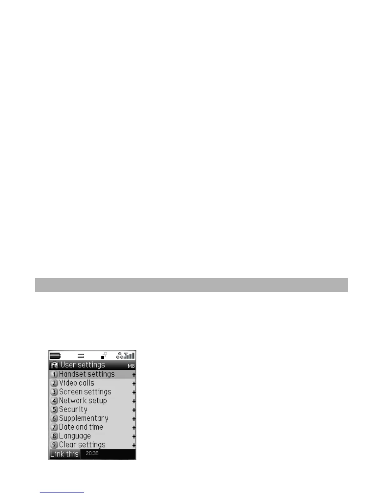 Press MENU key Select Settings icon or Press 8 User settings menu (see below).