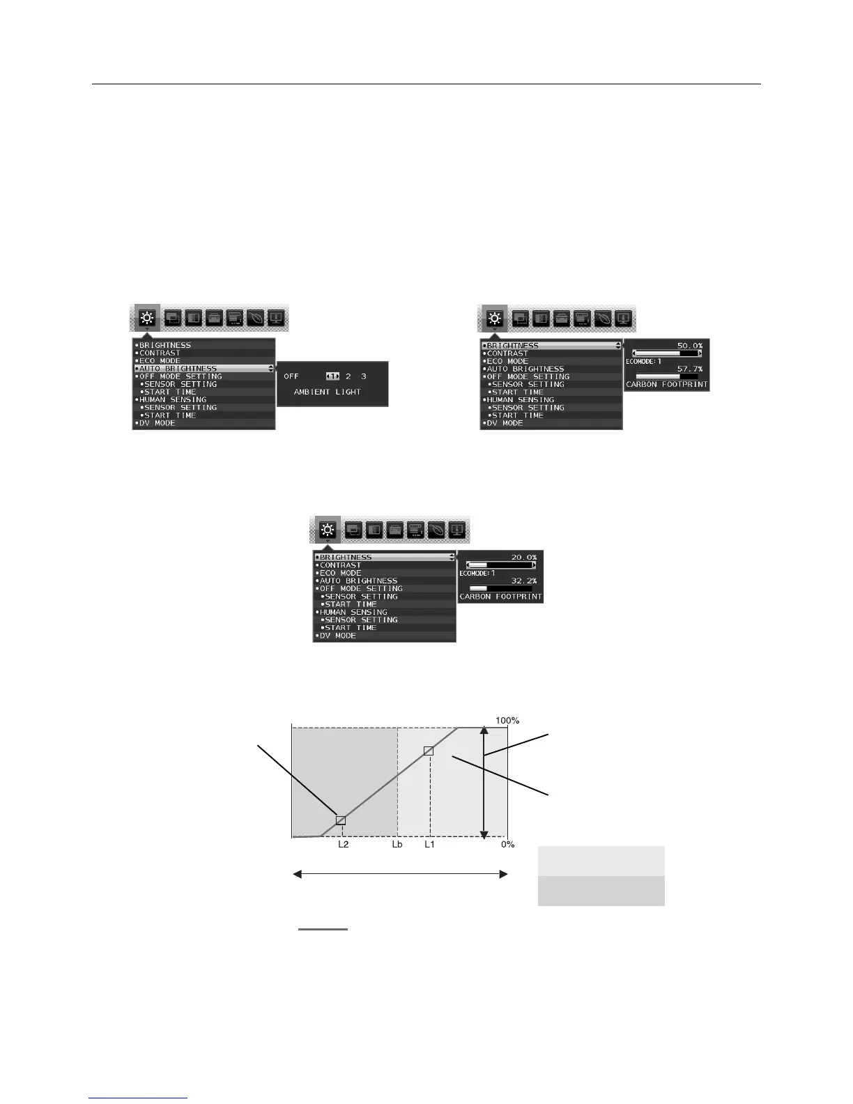 L1: BRIGHTNESS level set for the monitor to use when ambient lighting level is high (L1>Lb)