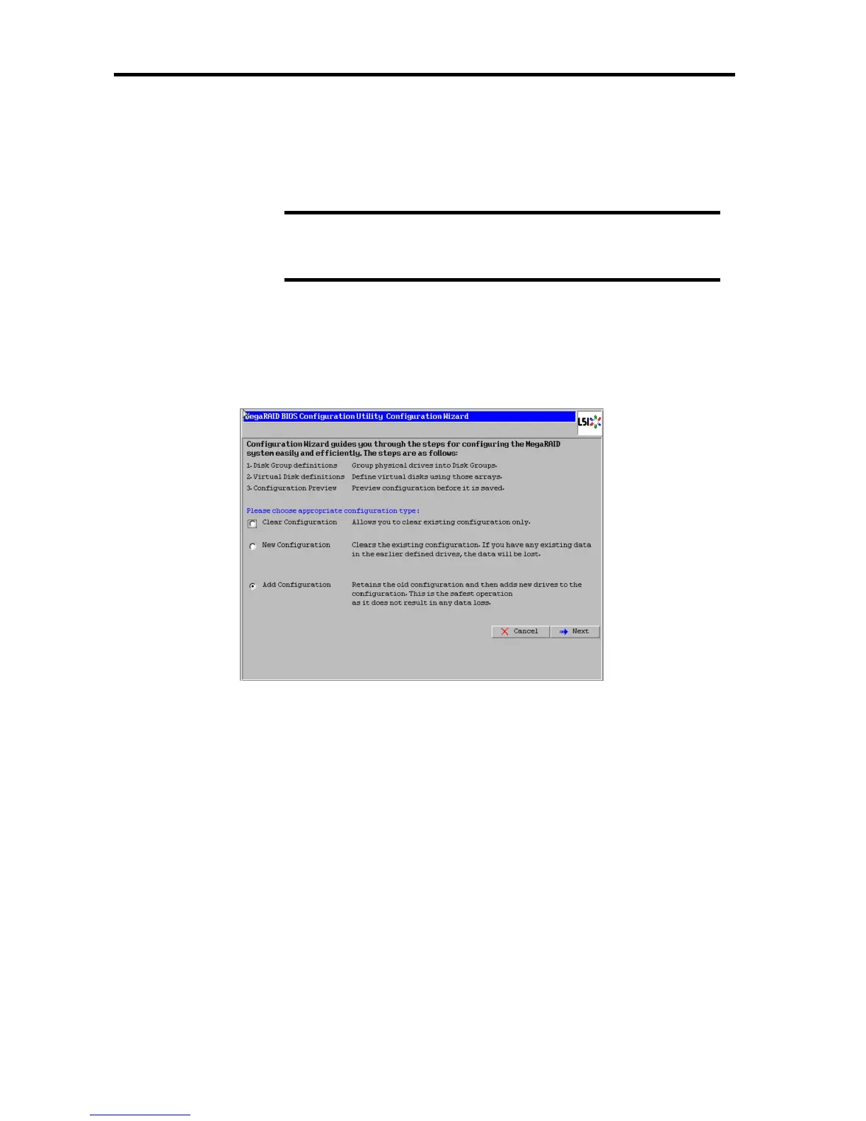 When you select [Configuration Wizard] on WebBIOS Home Menu and press Enter, the screen as