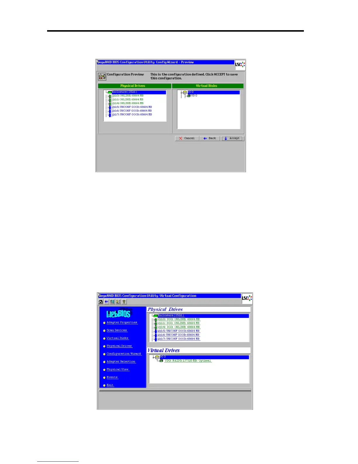 11. The WebBIOS Home Menu is displayed. Virtual Disk you have created is displayed in the