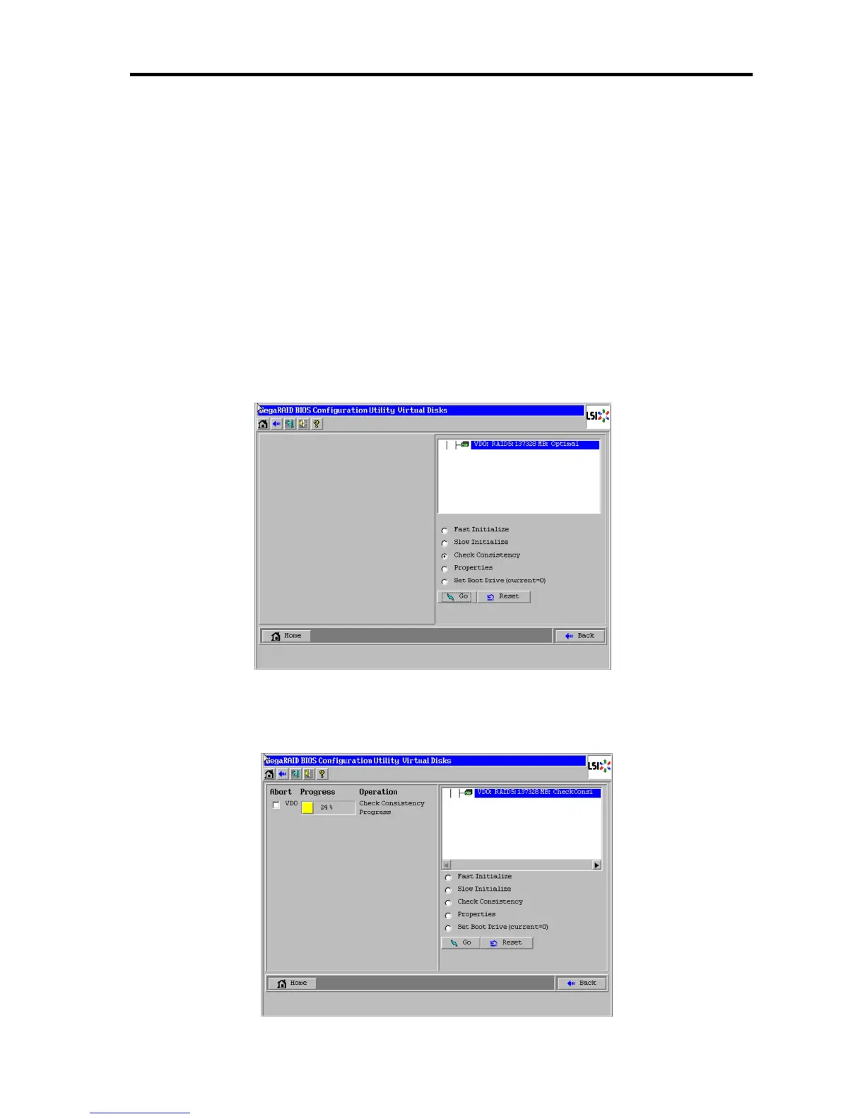 6. The progress of Check Consistency is displayed on the left frame of Virtual Disks screen.