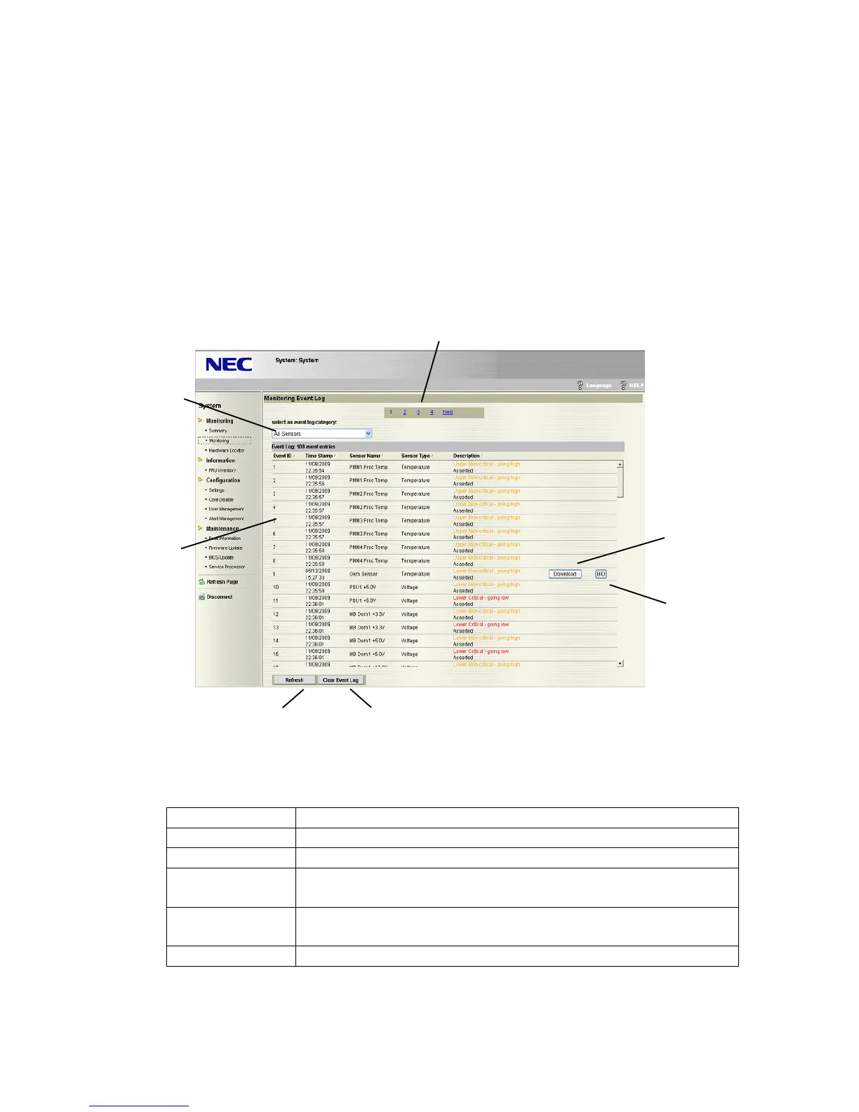 (1) Event log is displayed for 100 items per page. Switch pages of event logs to be displayed by