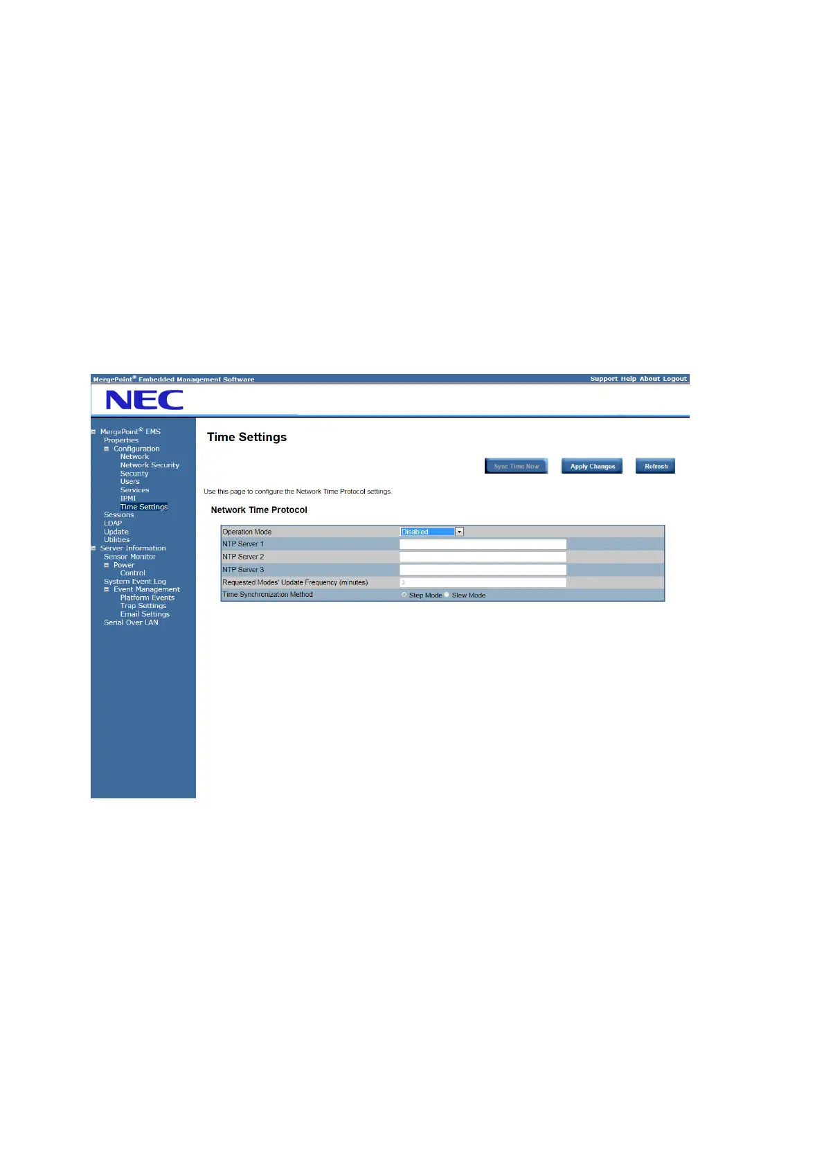 This screen provides the mechanism to configure the Network Time acquisition method. With