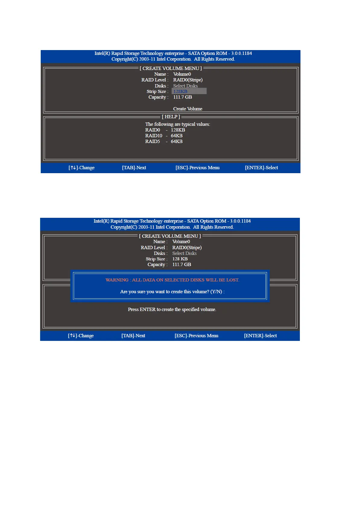 block size can be set from 4 KB to 128 KB. Once you have selected the stripe block size, press Enter.