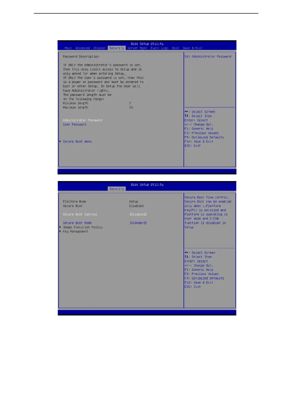 The Security menu allows you to safeguard and protect the system from unauthorized use by setting up
