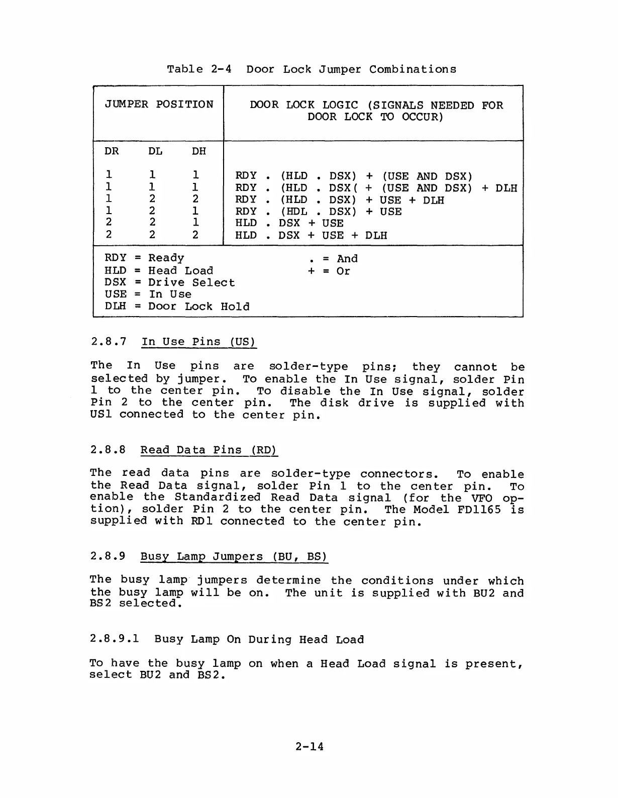 NEC FD1165 - In Use Pins (US); Read Data Pins (RD); Busy Lamp Jumpers (BU, BS); Busy Lamp on During Head Load